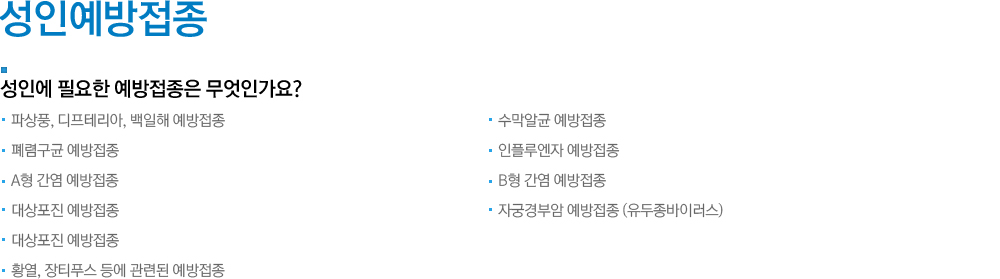 | 파상품/백일해/디프테리아 | Td/Tdap | 매 10년마다 Td 1회, 이 중 1회는 Tdap로 접종(Ⅰ) | |||||